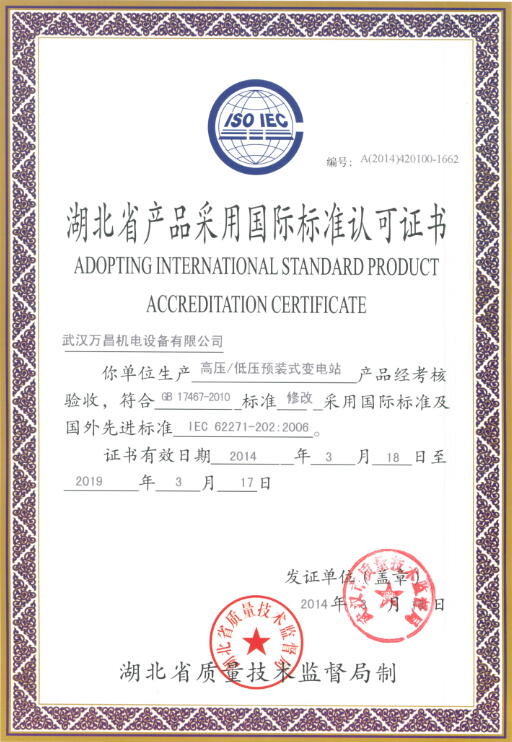 湖北省產(chǎn)品采用國際標(biāo)準(zhǔn)認(rèn)可證書(箱變)